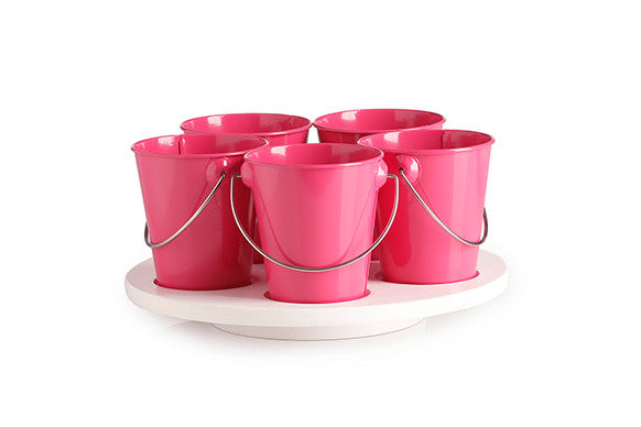 5 removable enamel buckets and a timber "lasy susan" style turntable.