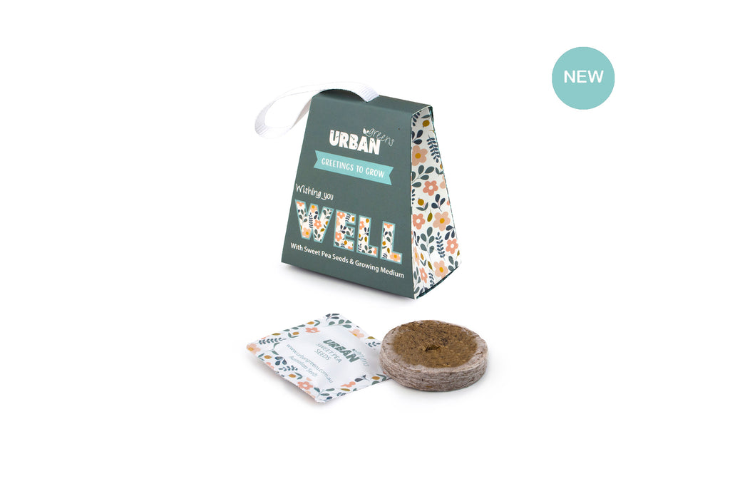 Each includes a sachet of Sweet Pea seeds, growing medium, clear instructions, and a convenient hanging ribbon.